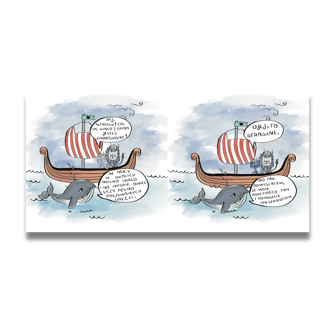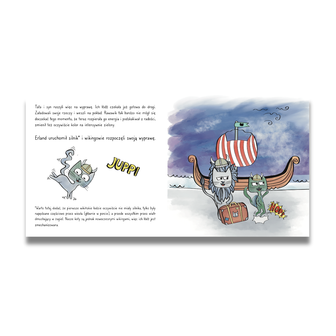 Rawawik to kot, który został wikingiem, jak jego tata. Nie ma się więc co dziwić, że uwielbia on ruszać na wyprawy z tatą ich wikińską łodzią. Kociak zawsze czeka z niecierpliwością na to wydarzenie. Każda podróż pełna jest niesamowitych przygód i wyjątkowych spotkań. Tym razem te dwa dzielne koty ruszyły z pomocą na Wyspę Owiec. Nad Wakakiki przeszła wichura, która strasznie nabałaganiła na tejże wyspie. Podczas prac porządkowych Rawawik odkrył coś, co bardzo go zachwyciło. Wyrusz z nim na wyprawę pełną przygód i sprawdź, co takiego znalazł kociak.